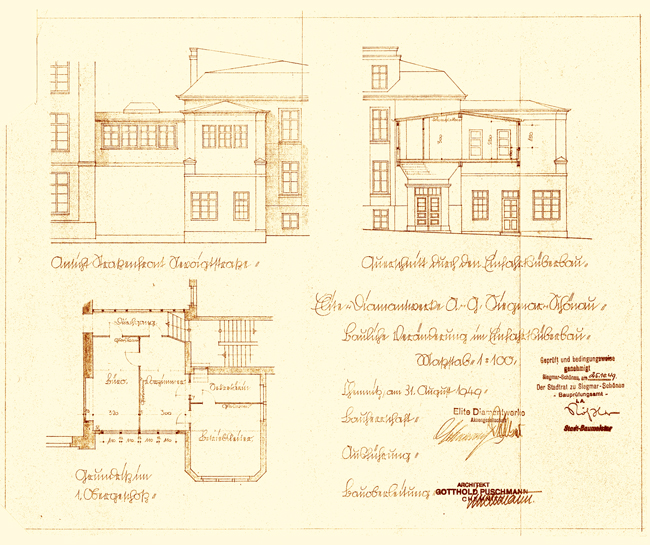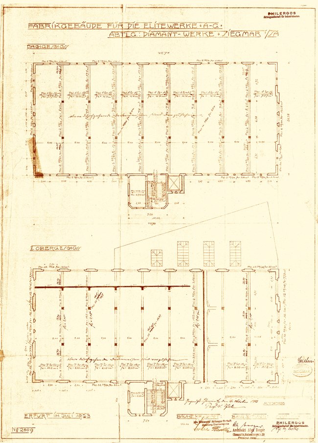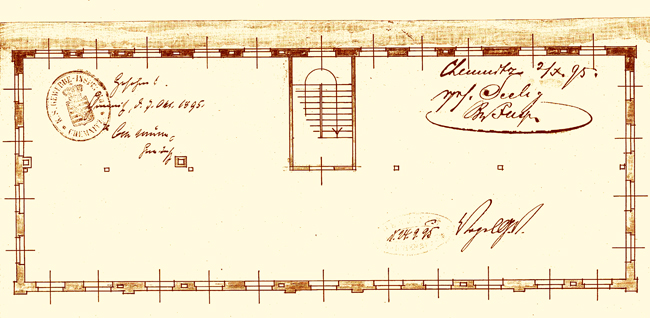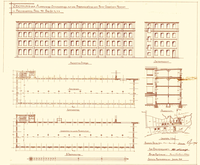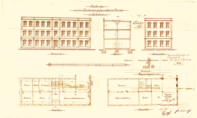 Das Fabrikationsgebäude von 1885. Erster Bauantrag. |